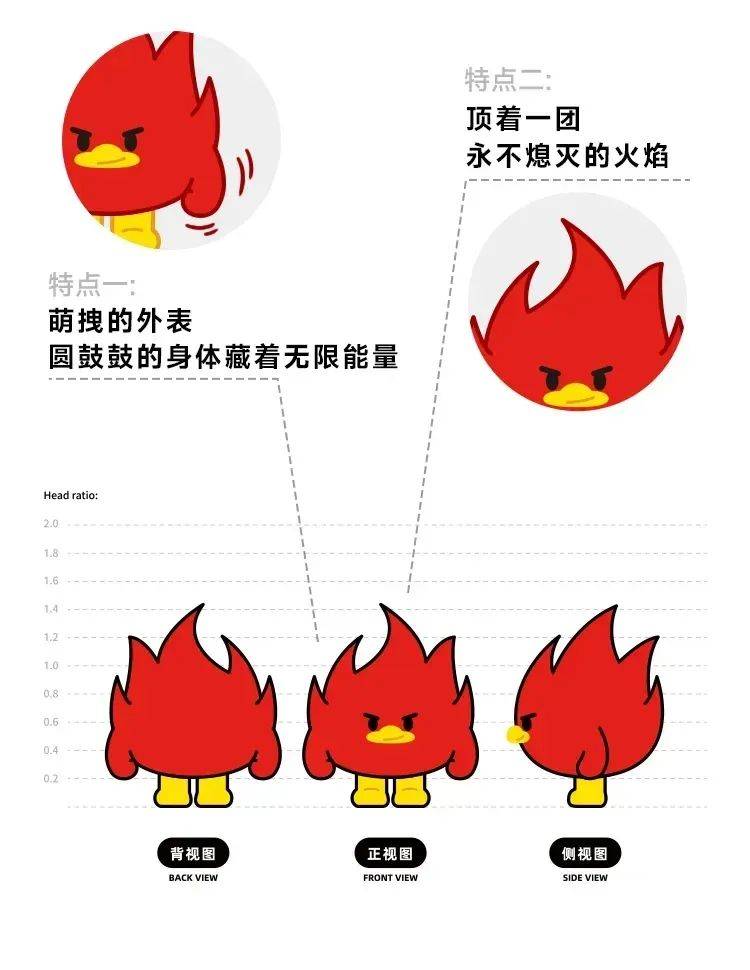 从不同视角观察小火鸭,都能发现其独特的设计巧思。正面视角下,小火鸭表情紧张,眉头紧锁,拳头紧握,展现出一种叛逆而火爆的个性;侧面视角则突出了其熊熊燃烧的火焰特征,象征着绝味鸭脖火辣的品牌特色;后视图则强调了身体的对称性,展现出一种和谐之美。