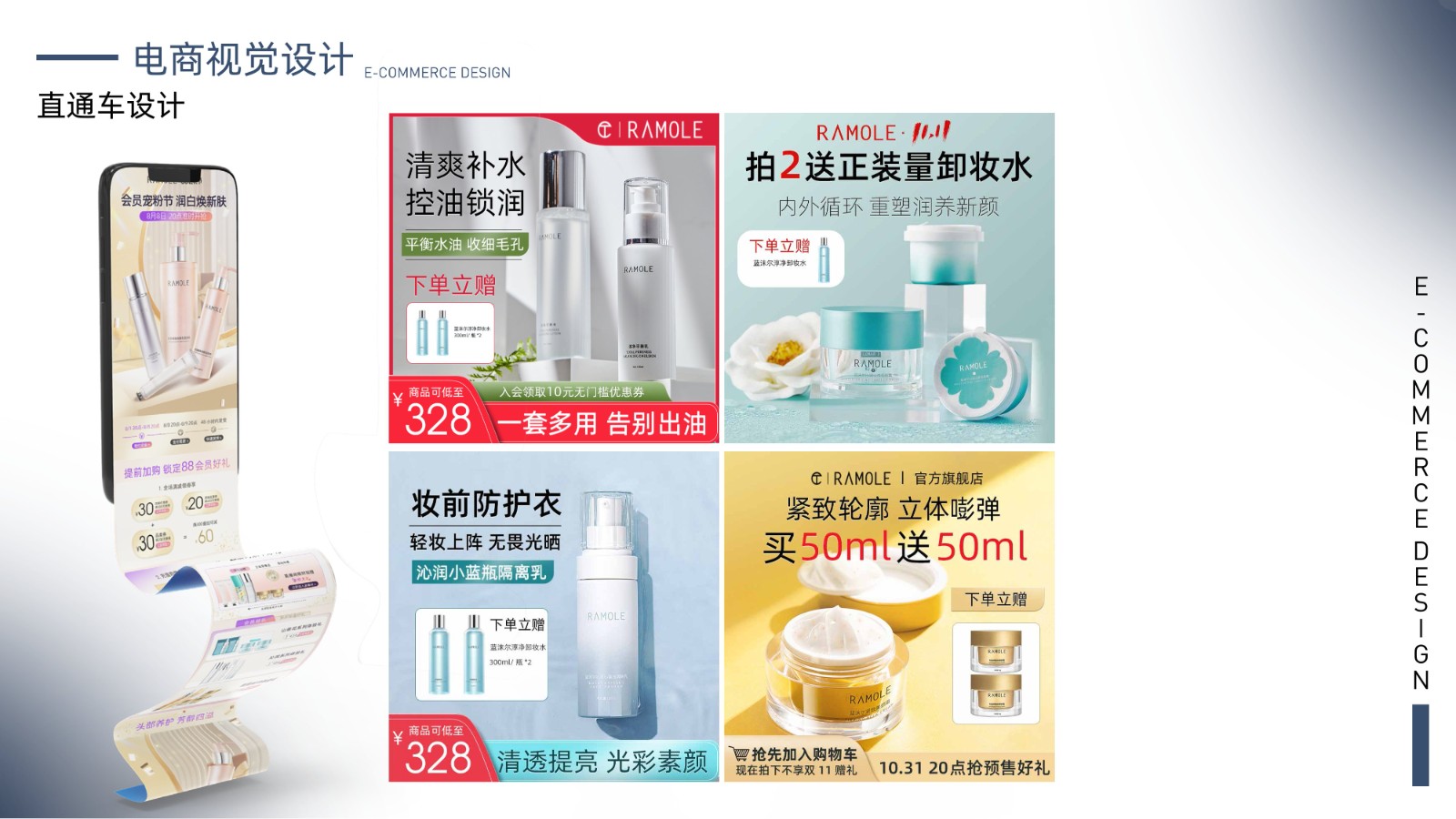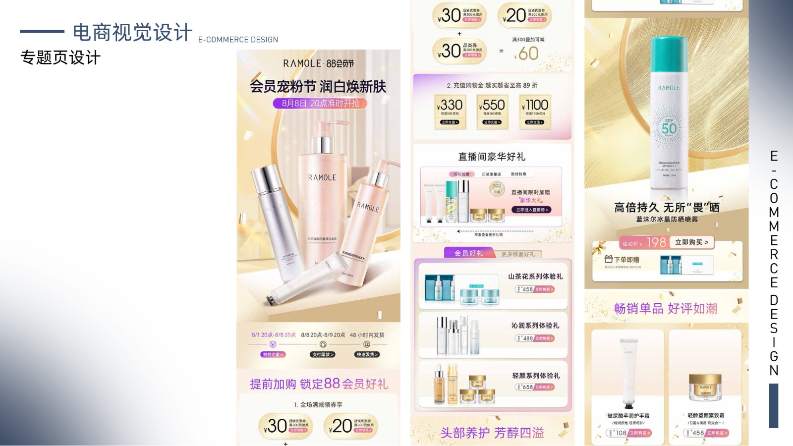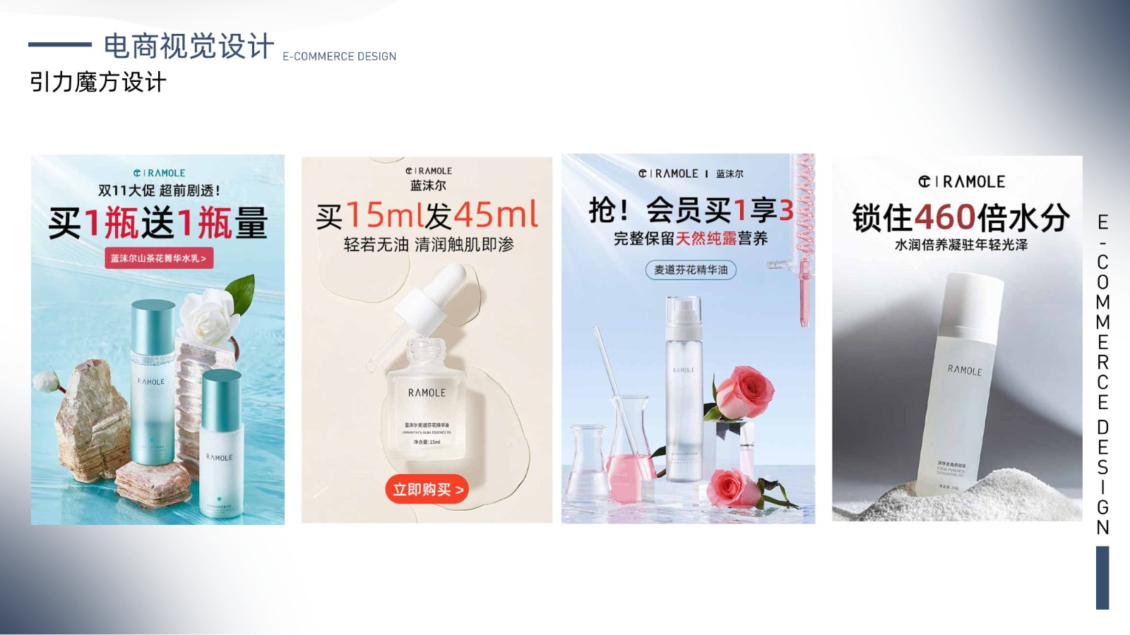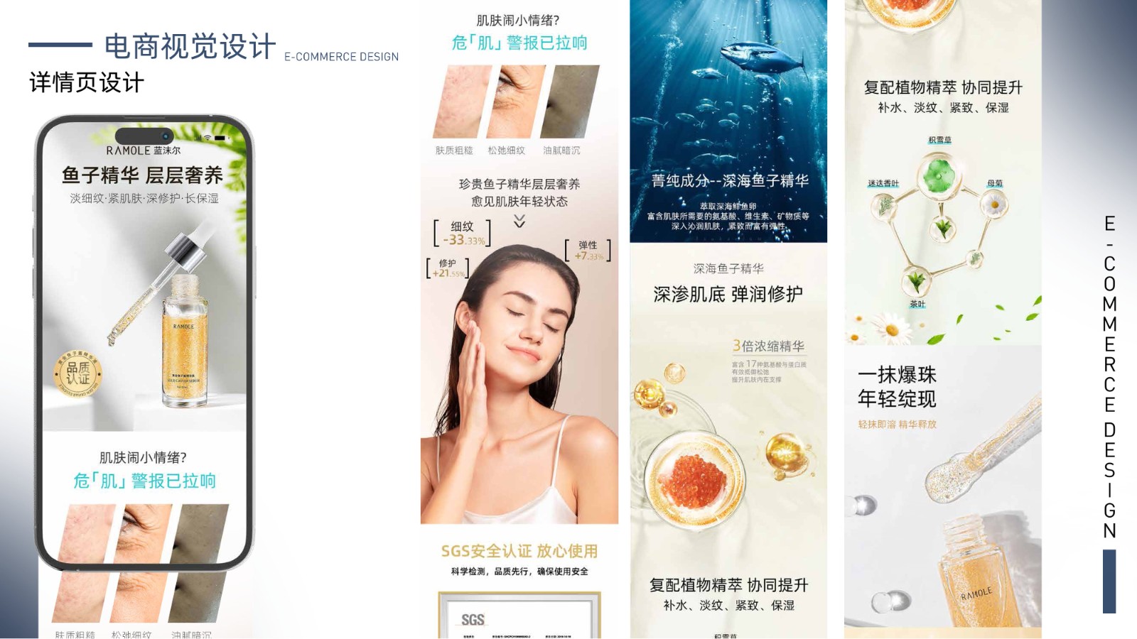 包括品牌视觉系统、产品包装设计、电商广告页面及用户界面设计,体现全面的视觉设计技能和用户体验优化能力,展示丰富的项目经验和设计思维。