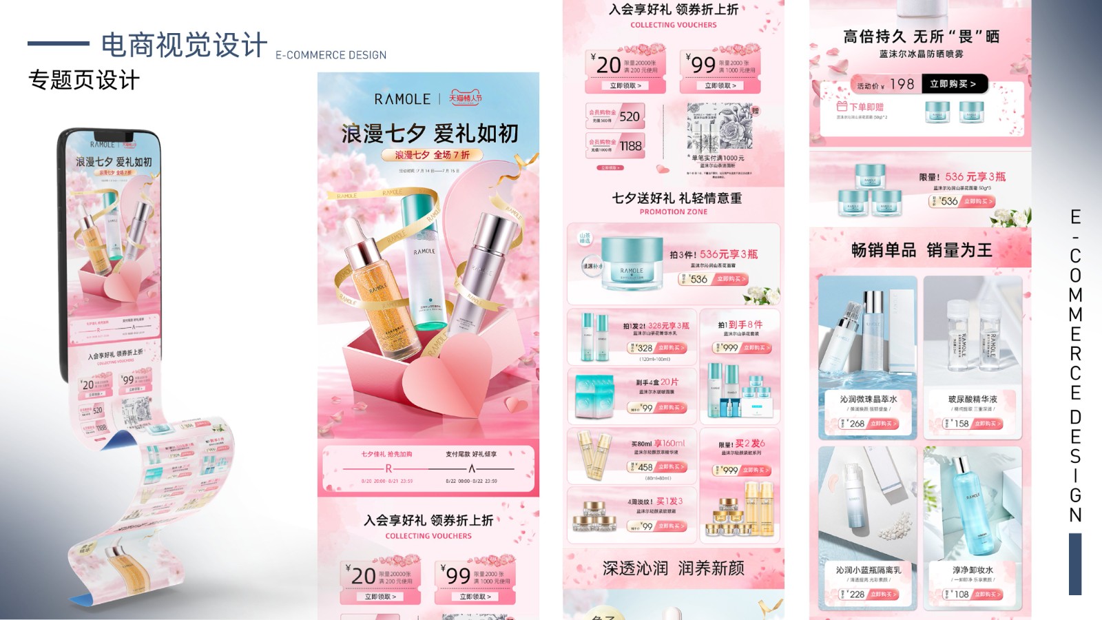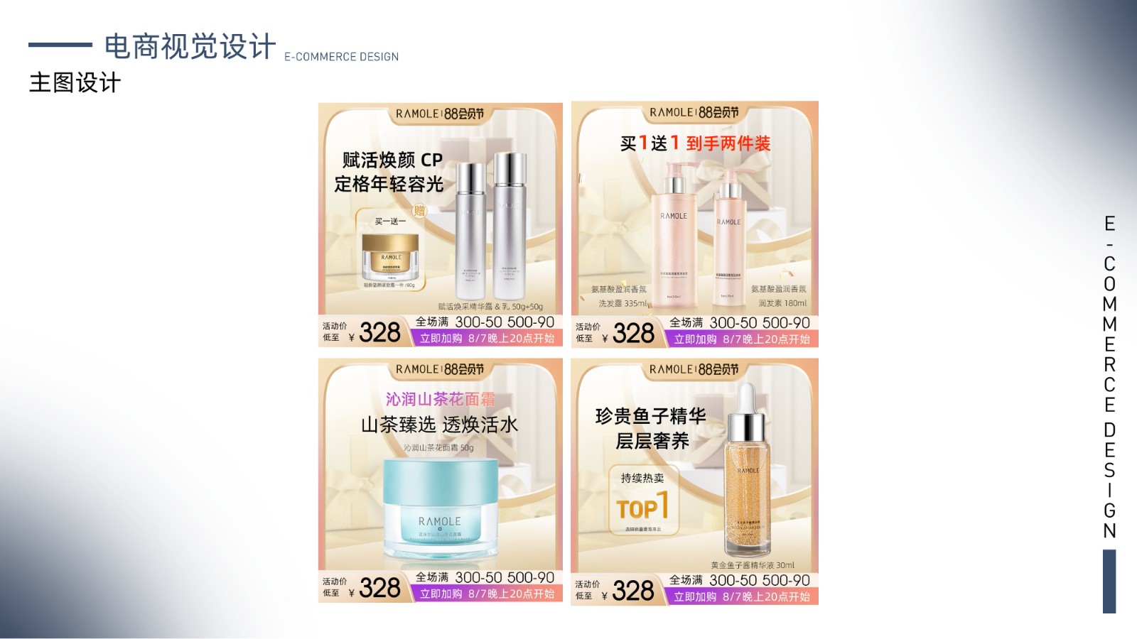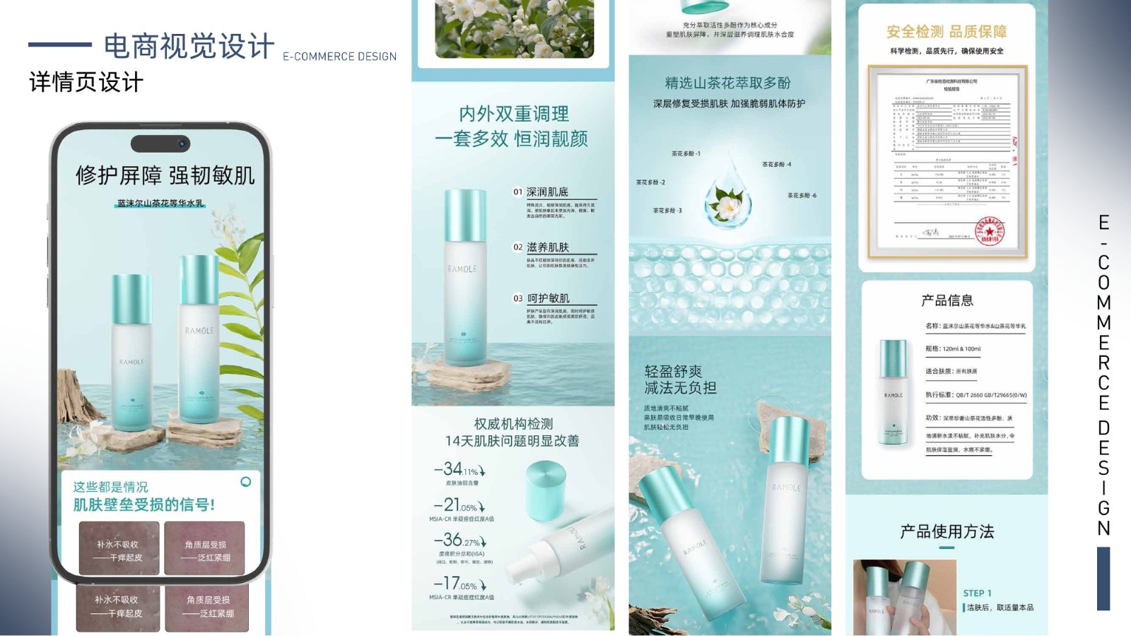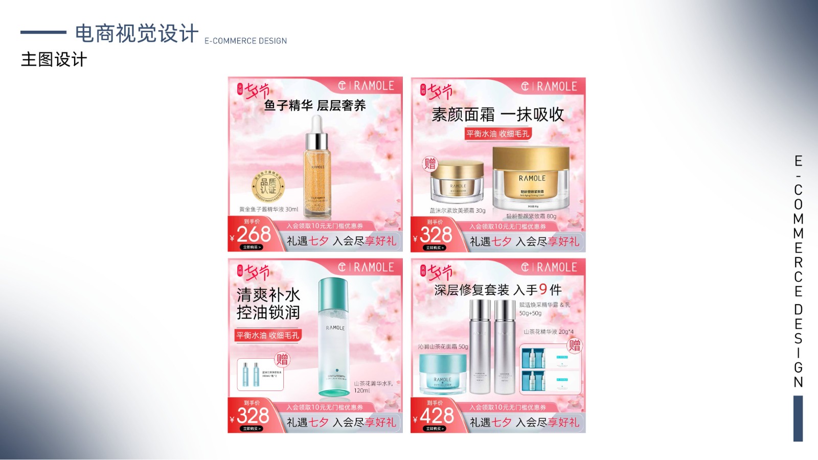 包括品牌视觉系统、产品包装设计、电商广告页面及用户界面设计,体现全面的视觉设计技能和用户体验优化能力,展示丰富的项目经验和设计思维。