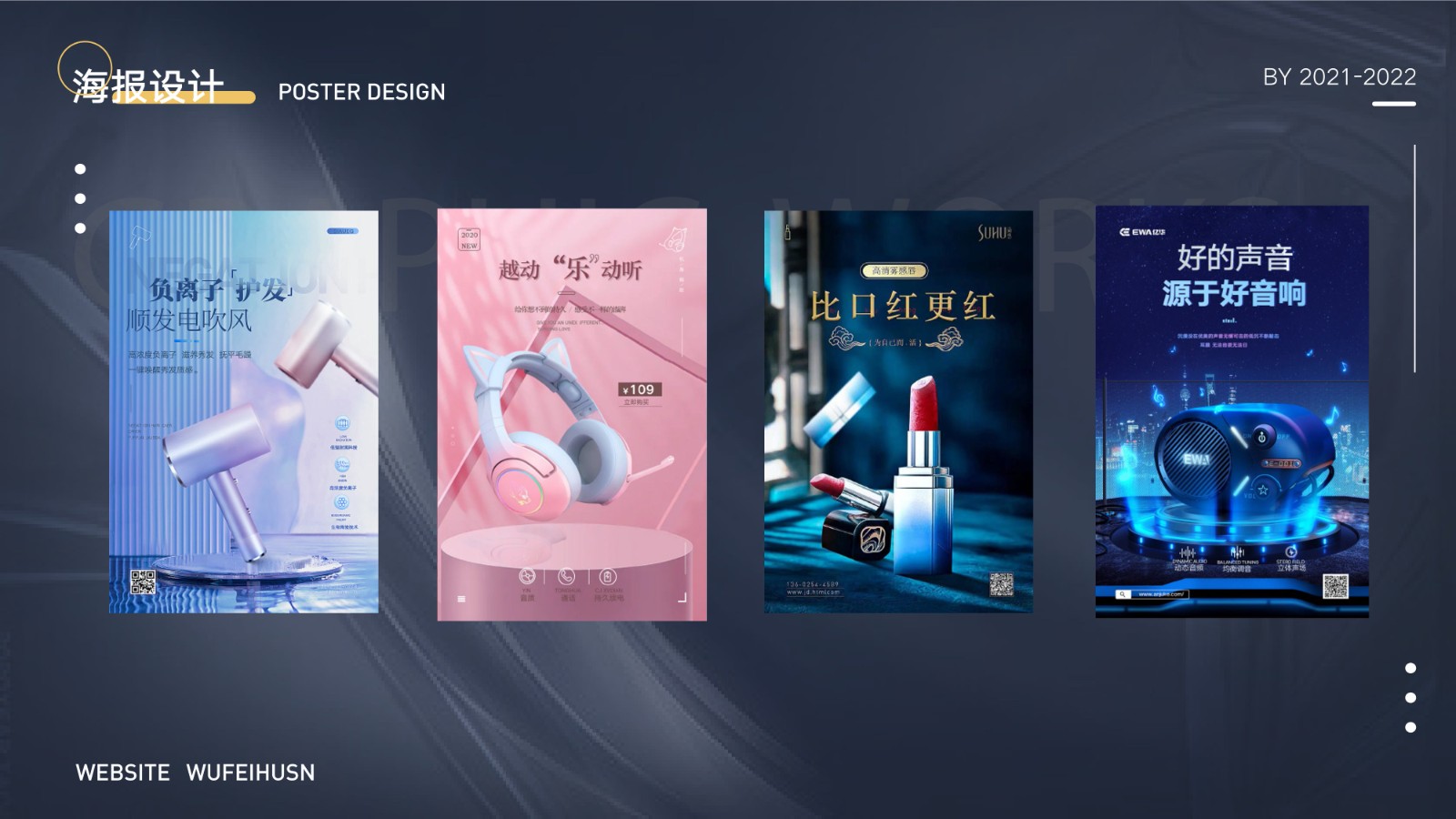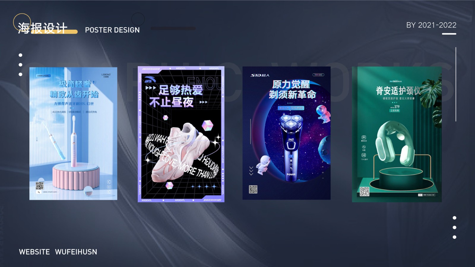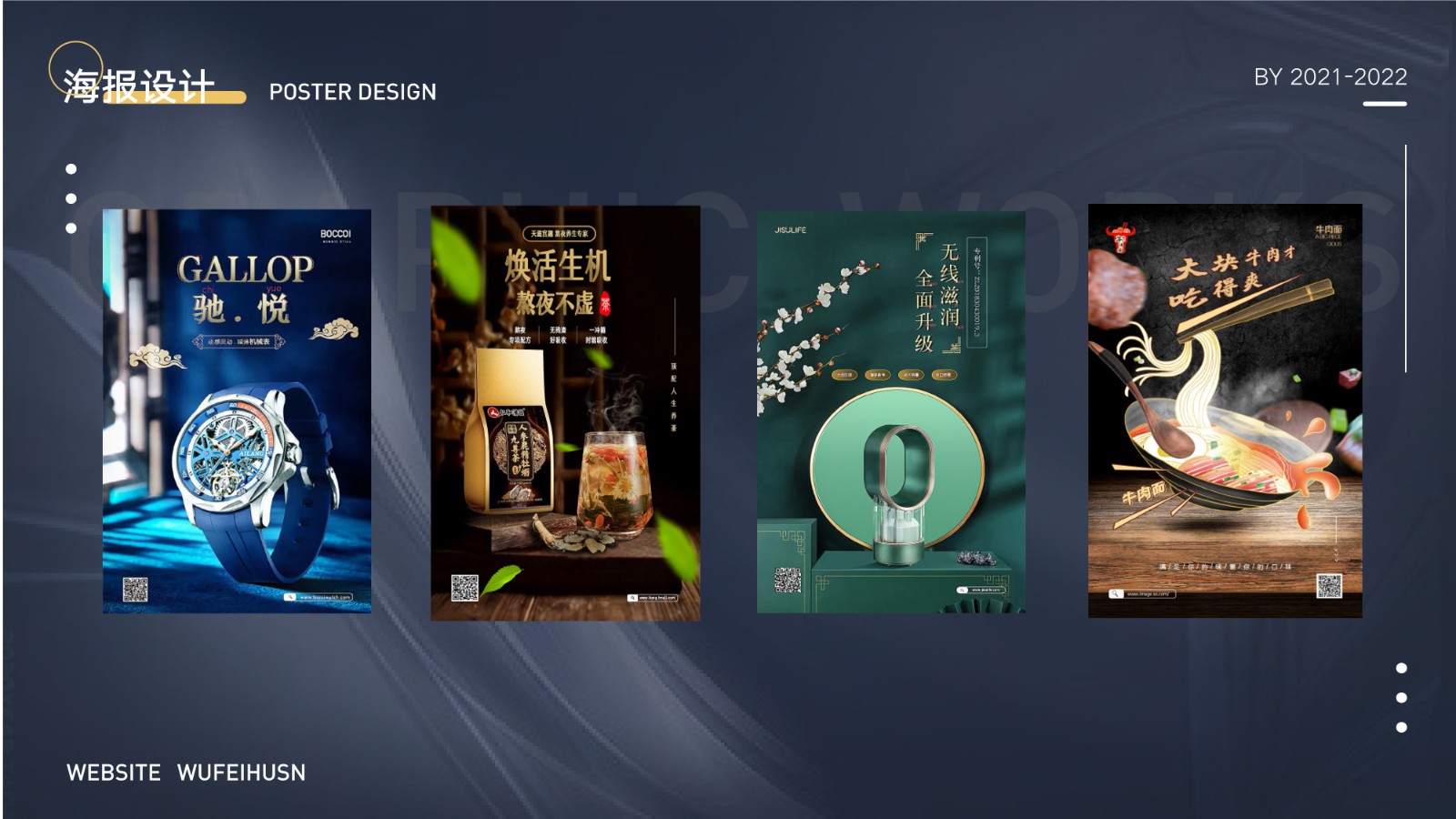 作品集展示广告物料全案,包括海报设计、传单设计、品牌广告,附带日常练手作品、3D建模和视觉传达设计。